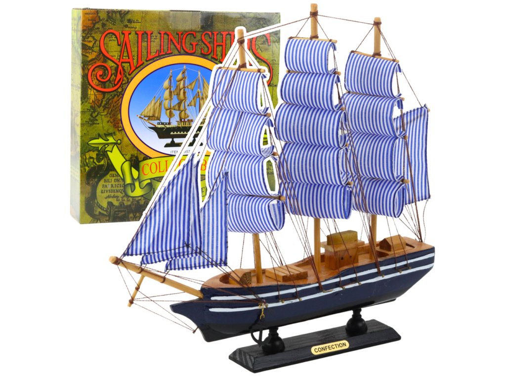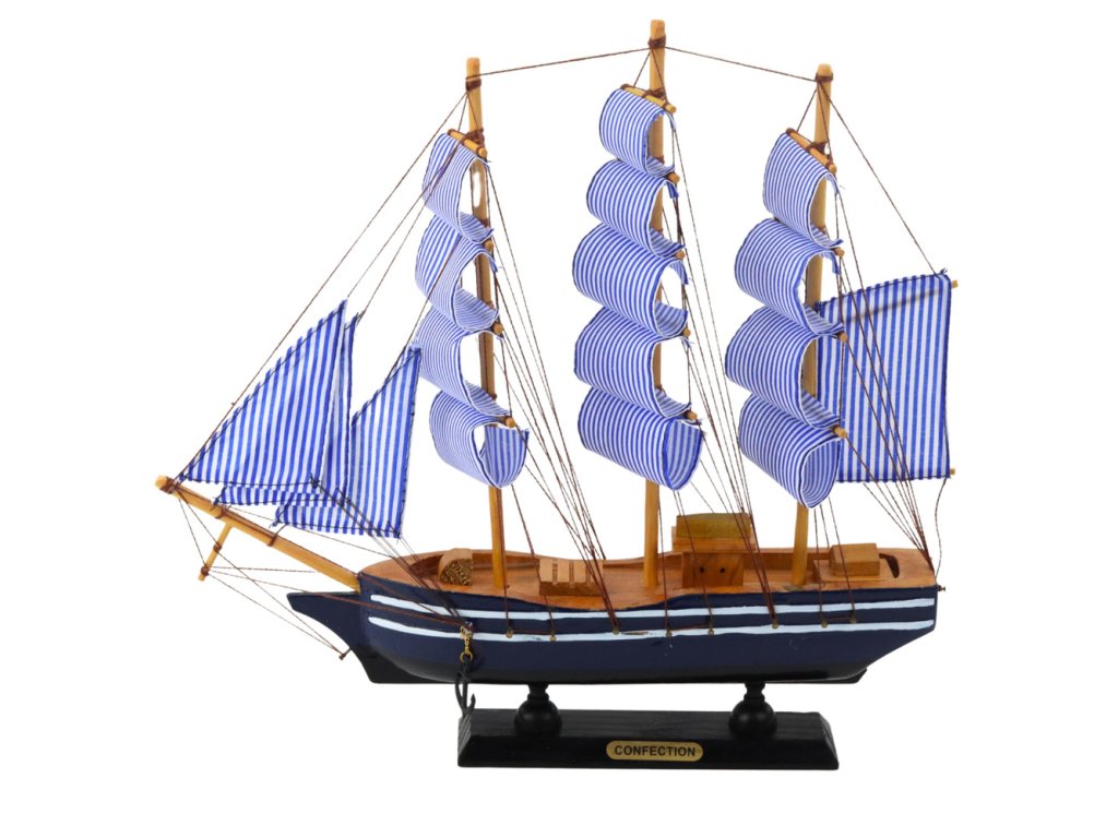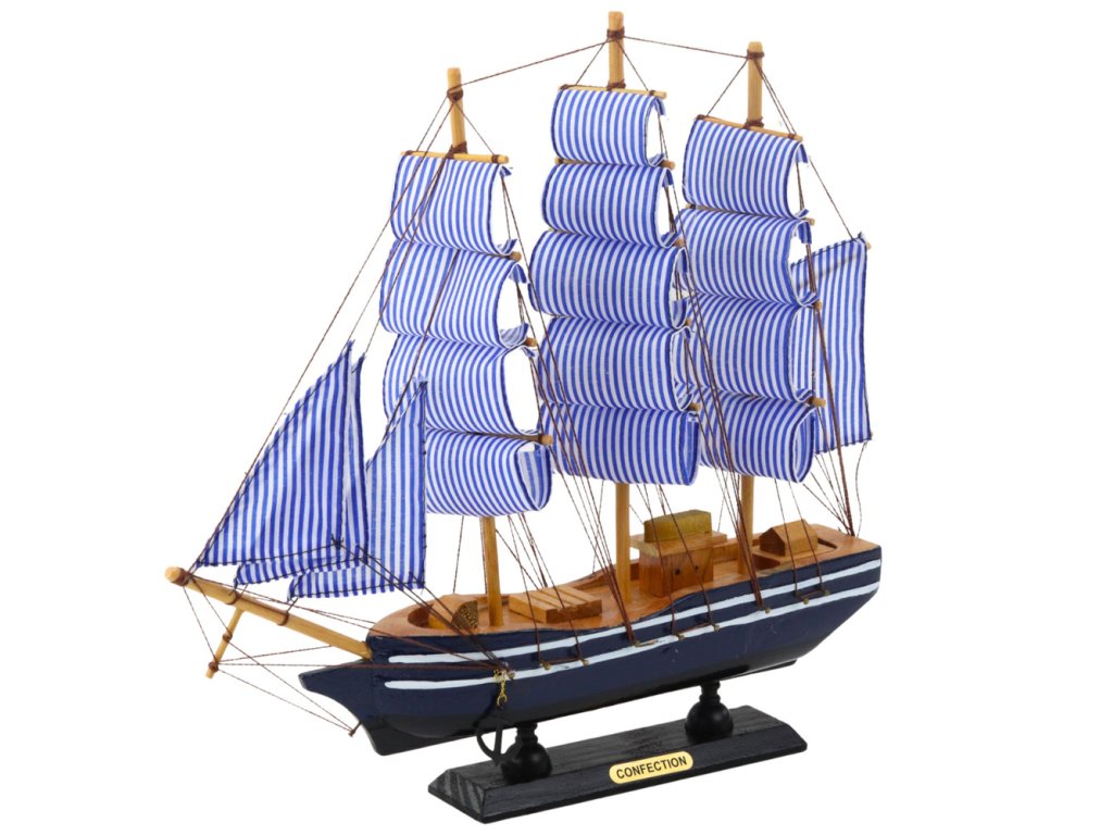 Námornícky modrý trup s bielymi pruhmi a čiernou základňou vytvára ucelenú, estetickú kompozíciu. Pruhované plachty odlišujú tento model od iných plachetníc a dodávajú mu ľahkosť a moderný charakter, napriek jeho klasickému usporiadaniu. Model je ideálny do námorných, retro alebo klasických interiérov a vďaka svojej malej veľkosti ho možno umiestniť aj do obmedzeného priestoru.
