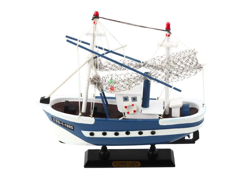 Model rybárskej lode Flying Lady je jedinečnou replikou inšpirovanou klasickými rybárskymi loďami používanými na pobrežný a prístavný rybolov. Charakteristický bielo-námornícky modrý trup s bočným označením „3 SS-1-1995“, kabína s realistickým prístreškom, sťažne a ozdobné rybárske siete priťahujú pozornosť a vnášajú do interiéru charakteristickú atmosféru prímorských miest. Vďaka kompaktnému dizajnu a dobre reprodukovaným proporciám model skvele funguje ako štýlový dekoratívny akcent.