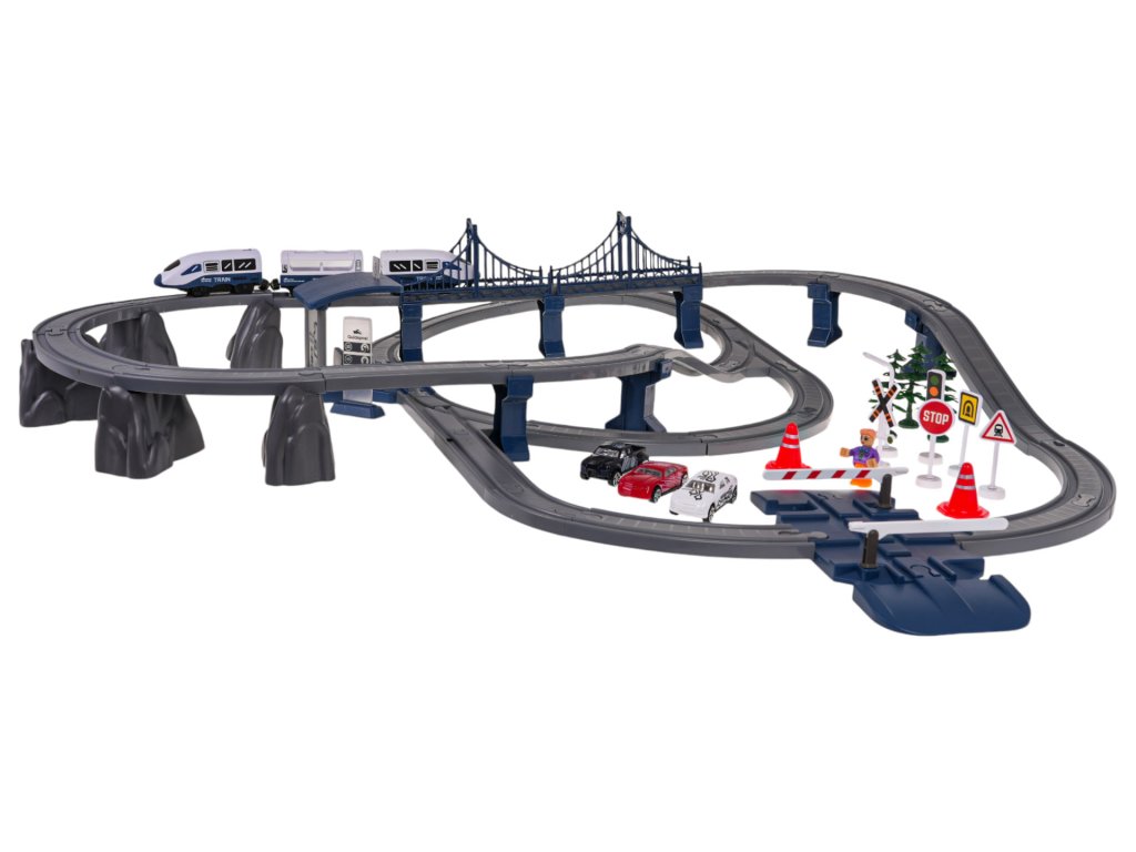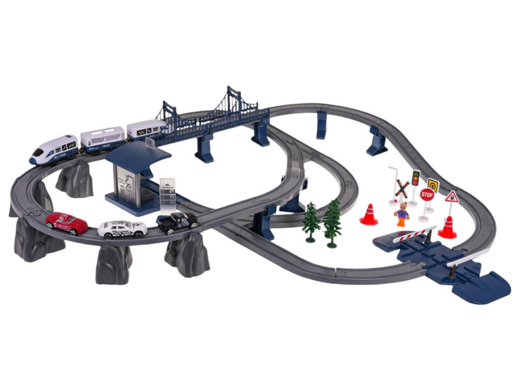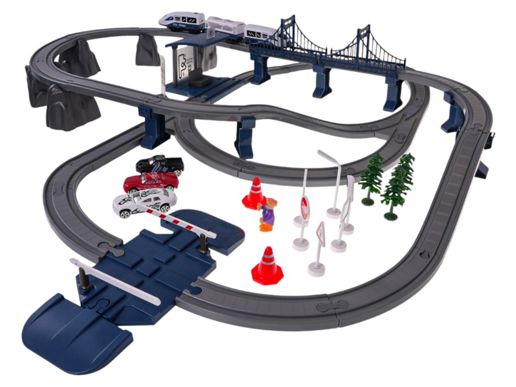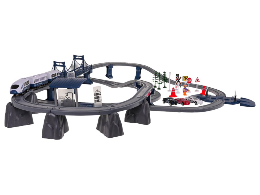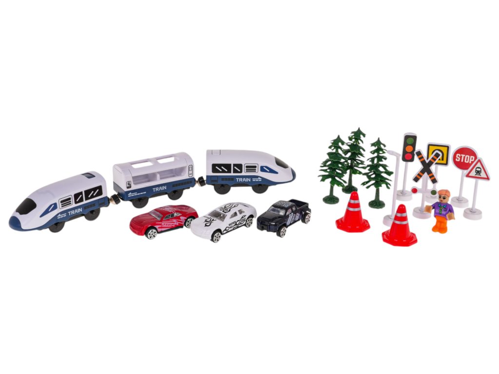- železničná trať, - stanica, - most, - vlak, - 4 dopravné značky, - semafory, - pouličné osvetlenie, - 3 stromy, - 2 x dopravné kužele, - 2 x zábrany, - 3 x autíčka, - figúrka. |