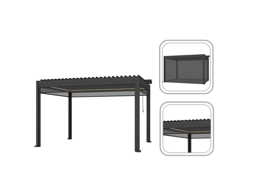 Ručná roleta bola navrhnutá ako praktický kryt, ktorý poskytuje ochranu pred slnkom a väčší komfort pri využívaní vonkajších priestorov. Je vyrobená z odolnej tkaniny Textilene Sunprey, ktorá dobre odoláva UV žiareniu a meniacim sa poveternostným podmienkam a zachováva dostatočné napnutie a stabilitu.Neutrálna sivá farba zaisťuje vizuálnu súlad s modernými pergolami.