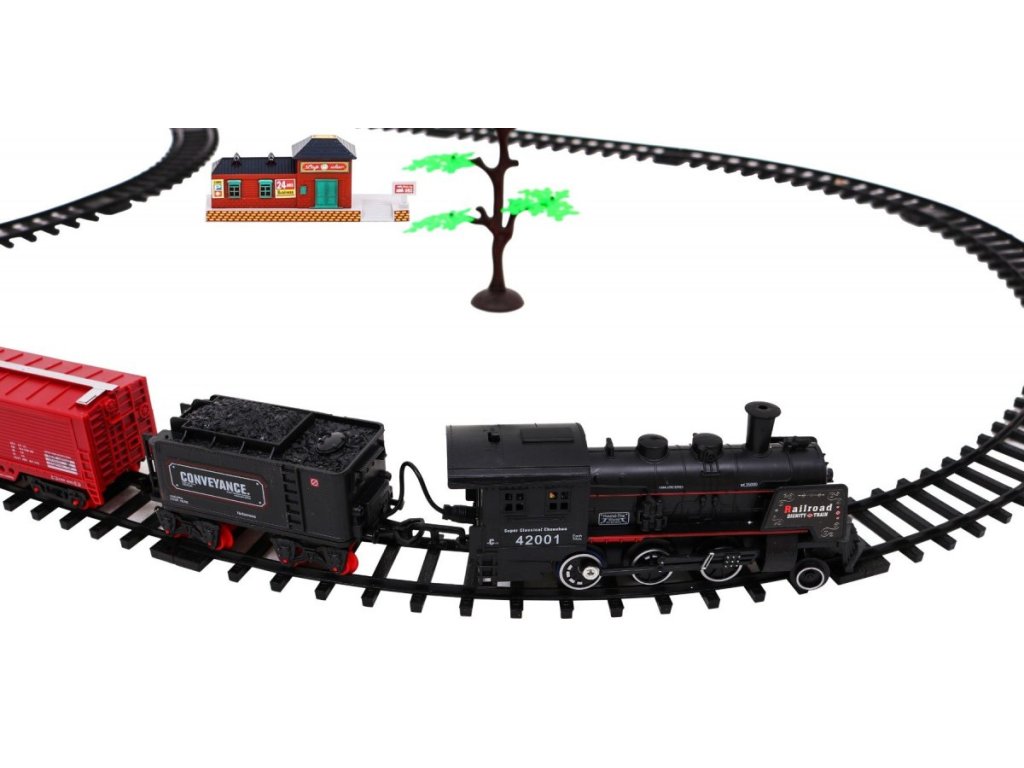 | | Trať má eliptický tvar s dvoma výhybkami a vnútorným kruhom s rozmermi približne 78 cm x 156 cm. Počas jazdy lokomotíva vypúšťa dym z komína a svieti svetlo namontované na prednej časti. Koľajnice majú charakteristický a ľahko spojiteľný dizajn, vďaka čomu sú bezpečné a odolné pri používaní. |